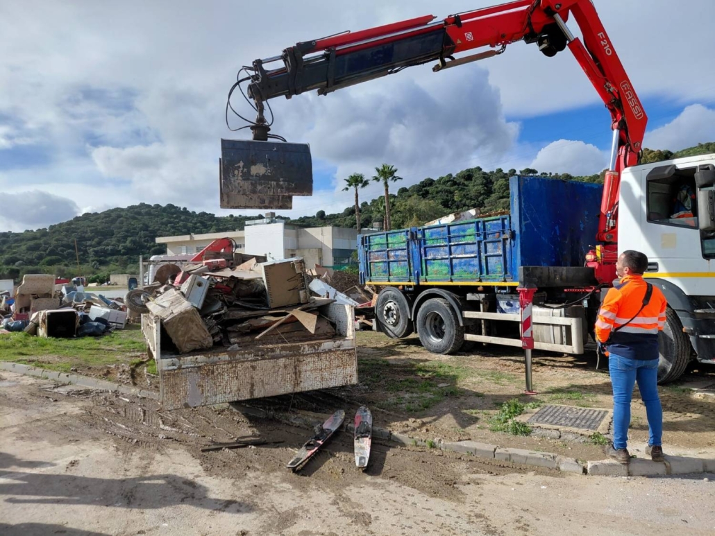 Urbaser ha dispuesto varios camiones pluma y de carga para trasladar al Complejo Ambiental Costa del Sol los enseres y residuos voluminosos que se han deteriorado con las fuertes lluvias y que han afectado a numerosas viviendas de Secadero.